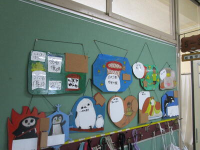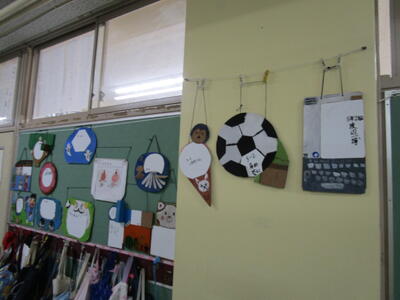 5年生は、図工で電動糸のこを使って、曲線や細かい凹凸を切るのに挑戦しました。出来上がった掲示板が教室の前に掲示してありました。