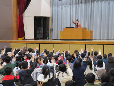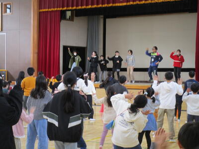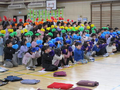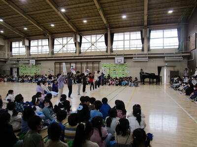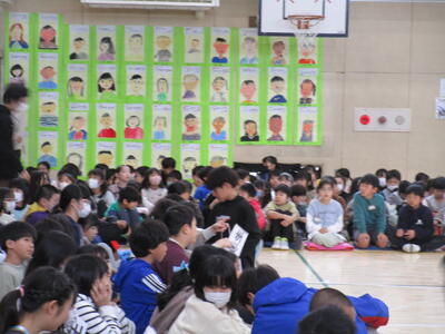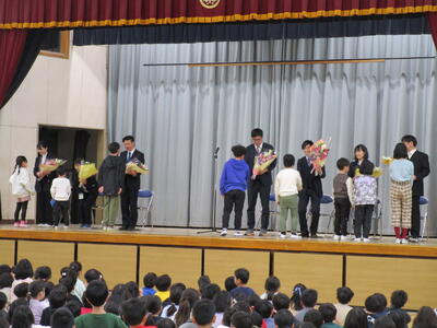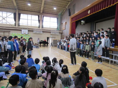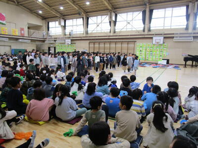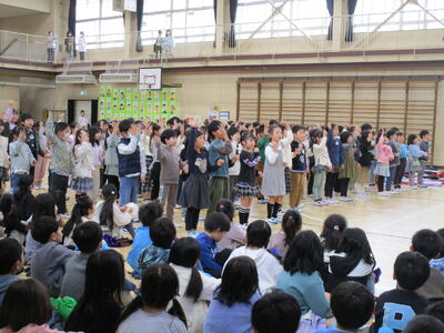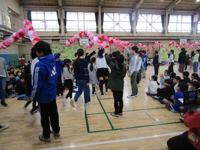 「卒業を祝う会」を体育館で全校で行いました。6年生が、5年生の用意したアーチをくぐって、1年生と一緒に入場し、ひな壇に並びました。ひな壇に並んだ6年生は、少し照れながら笑顔をみせてくれました。その後、各学年の発表がありました。トップバッターは、4年生の〇×クイズ。2年生は、「にじ」の替え歌や劇。3年生は、並べ替えクイズと「負けないで」の歌。