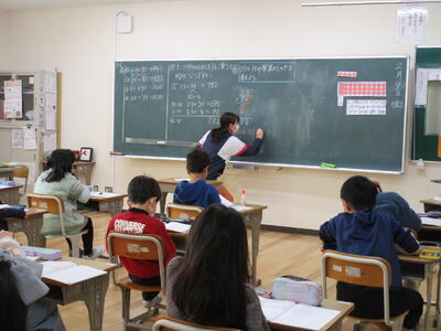 3年生、算数で二桁×二桁の筆算の学習をしていました。少人数教室と教室の2か所に分かれて、考え方ややり方を確認しています。一つの教室に10数名なので、個別指導も充実していました。