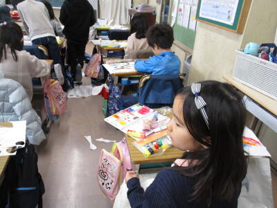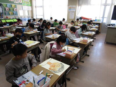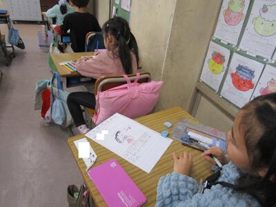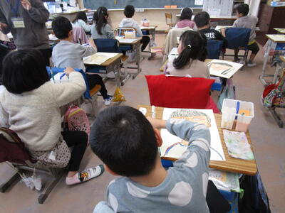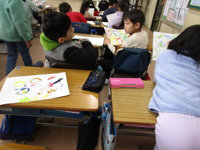 1年生、先日描いた6年生の似顔絵に絵の具で色をつけていました。どの子も気持ちを込めて丁寧に色塗りをしていました。