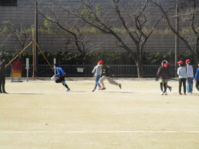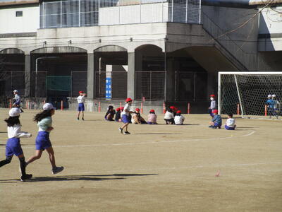 2年生、体育で、マラソンをしたりサッカーをしたりしています。今日ぐらい暖かいと活動しやすいですね。