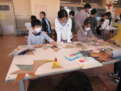 4年生、図工室で、板を切ったり貼ったり塗ったりして作品を仕上げています。のこぎりの使い方もずいぶん上手になり、切り口もきれいに切れていました。