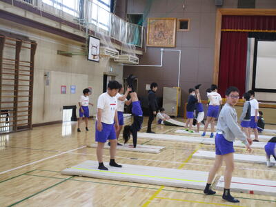 5年生、体育館体育で、マットの連続技に挑戦していました。前転、後転、側転などの技を組み合わせていました。その後、二人組で逆立ちをし、それを補助をする練習もしていました。