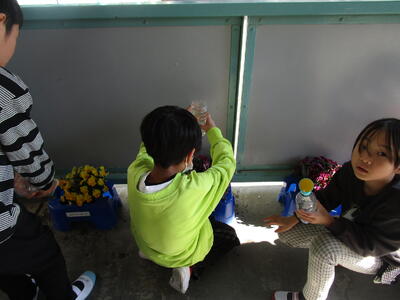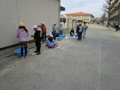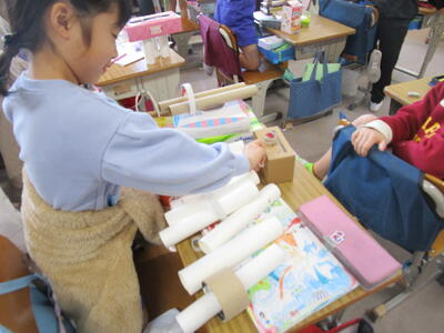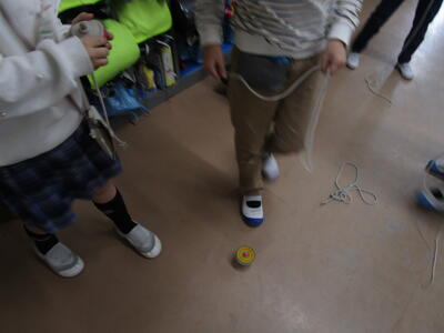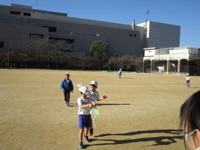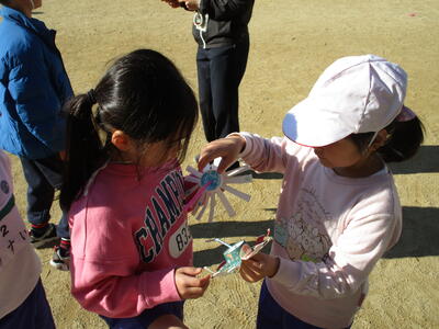1年生、生活科の「かぜとなかよし」で、自分が作ったおもちゃを使って外で遊んでいました。