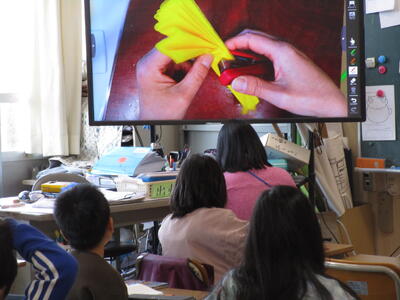 2年生、卒業を祝う会で、自分たちがつけるお花を作るところです。花の作り方の説明も、手元を拡大して大きな画像で見られるので、とてもわかりやすいですね。