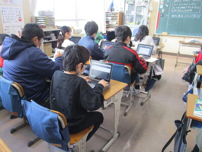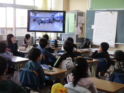 2年生、卒業を祝う会の練習の様子を録画して、教室で見返しています。録画をみながら、振り付けを確認している児童もいました。改善点をみつけて練習し、よりよい発表になるといいですね。