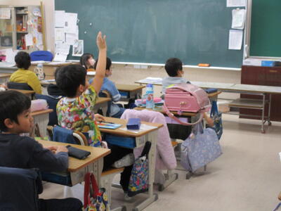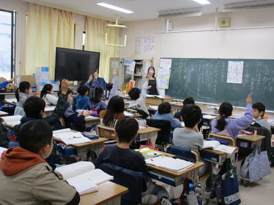 2年生、算数の「なんばんめ」の始まりの学習です。「今、自分が座っている席は、右から何番目ですか?右から3番目の人、手をあげましょう!」最初のうちは、確認しながら手を挙げていた子供たちも、何度か繰り返すと、素早く手を挙げていました。