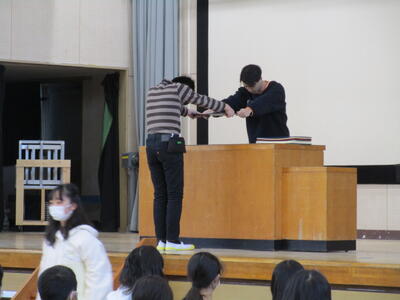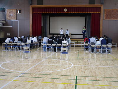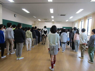 6年生、卒業式にむけて、学年合同練習が始まりました。学年主任の先生から、卒業式にむけての心構えや流れ等を話した後に、姿勢や礼の仕方など礼法の練習をしました。礼の仕方は、先生から正しいお辞儀の仕方を教わった後に、二人組や三人組でしっかりできているか確認をしていました。