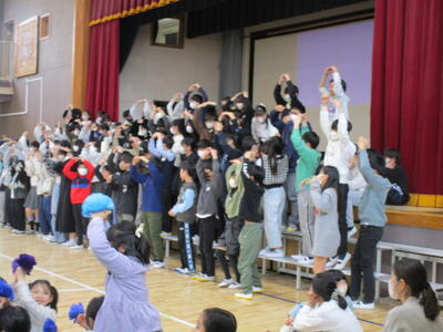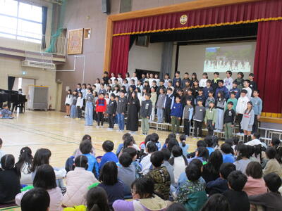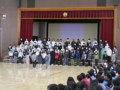 その後、5年生が6年生のいいところ「ベスト3」を劇をやりながら発表し、その中で「にじ」を6年生と一緒に歌うシーンもありました。5年生と6年生の合唱は、迫力があり、体育館に響き渡りました。1年生は、「ありがとうの花」の替え歌を手話を交えて歌いました。どの学年の発表も、6年生に感謝の気持ちを込めて、一生懸命に発表していました。
