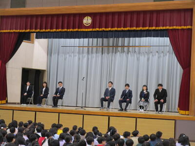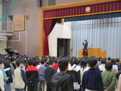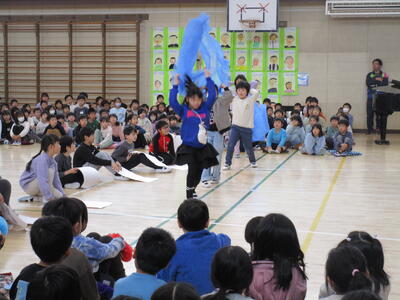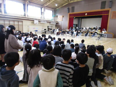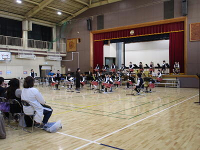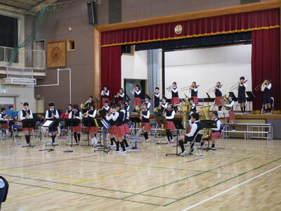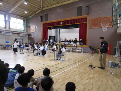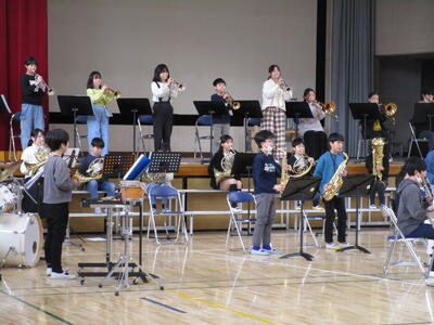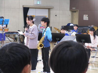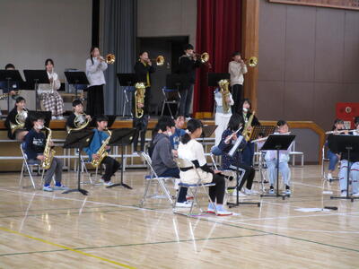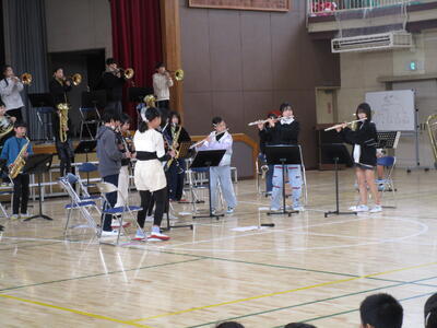 業間休みには、吹奏楽部がスプリングコンサートの演奏の一部を体育館で1年生~3年生対象に発表しました。「ちぐはぐ」は踊りながら演奏するシーンがあり、「スーパーマリオブラザーズ」はゲームで聞きなじみのある曲だったので、低学年の子たちも、楽しみながら聞いていました。