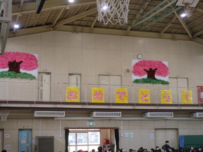 その後、プレゼント紹介がありました。1年生からは6年生の似顔絵、2~5年生からは花紙で作った桜の木で、どちらも体育館に掲示されていました。6年生からは、各クラスにストロー入れのプレゼントが紹介されました。最後に6年生が「旅立ちの日に」を歌いました。間奏に、下級生と先生方に思い出と感謝の言葉を入れ、素晴らしい歌声を披露しました。