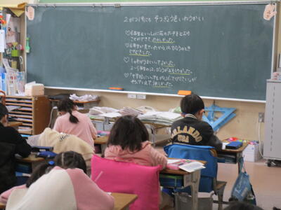 2年生、2月3日の節分に向けて、自分が追い払いたい鬼について考え、ワークシートを書いていました。「食べすぎ鬼」「ねぼう鬼」「わすれもの鬼」などなど、一人ひとりの子が、よく考えて、自分の中でやめたいことをしっかり書いていました。