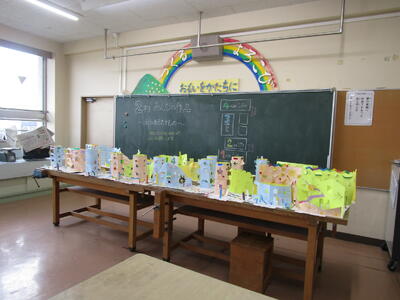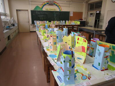 2年生、図工の作品「まどのあるたてもの」が全クラス分、図工室に飾られていました。全員分集めると、カラフルで新しい街ができたかのようです。