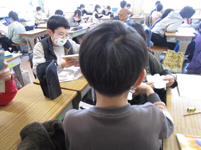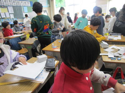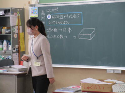 算数の学習で、2年生は、箱の形の頂点や辺の数を調べていました。4年生は、立方体や直方体の展開図、5年生は三角柱や六角柱の展開図に挑戦していました。