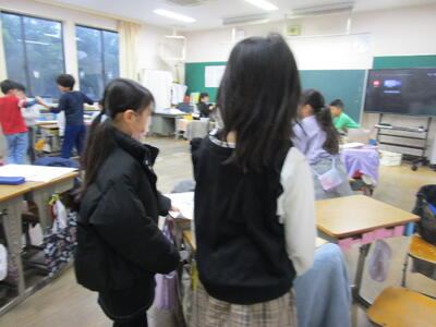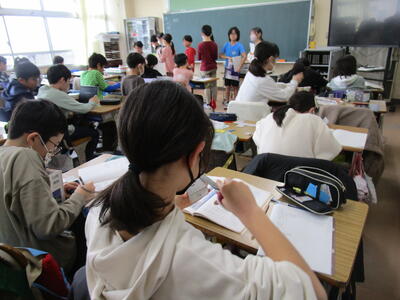 6年1組は、家庭科で生活時間をマネジメントする学習をしていました。自分の生活時間を振り返り、気づいたことや問題点をあげていました。「家族のだんらん時間が少ない」「夜寝るのが遅い」「手伝いができていない」など問題点について話し合っていました。3組では、2組の先生が社会科の授業で「資料集の中の偉人シールは自分のノートに使っていきます」など資料集の使い方について確認していました。2組の子供たちは、3組の先生と校庭でリレーの練習をしていました。6年生は、昨年度に引き続き、教科担任制の授業が始まりました。
