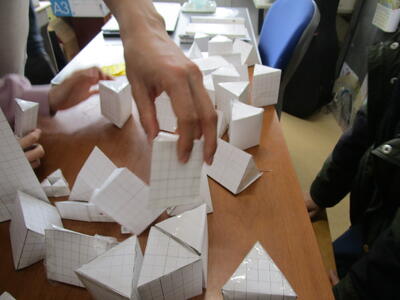 5年生、算数の体積の学習で、実際に縦3cm横5cm高さ4cmの直方体や、一辺4cmの立方体を、1㎤のつみきを使って組み立てていました。具体物を操作することで、意味がしっかり理解できますね。