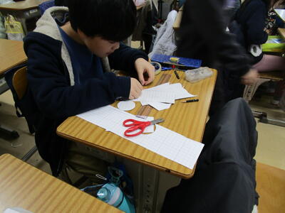 5年生、算数で、方眼紙を使って円柱づくりに挑戦です。「三角柱や六角柱より難しい」と言いながら、夢中になって作っていました。