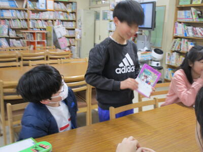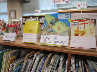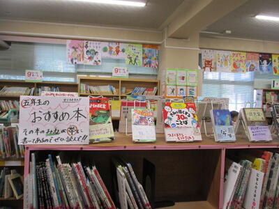5年生が国語の学習で作ったおすすめの本を推薦するために作った帯。実際にその帯をつけた本が、図書室に置かれています。今日は、1年生が図書室を使っていましたが、帯を見て、本を手に取り読んでいる子もいました。