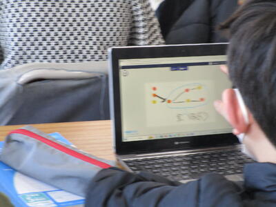 6年生、算数の線対称・点対称の学習でタブレットを使っていました。教科書についているQRコードを読み取ると、自分の画面にでてくる「M」の文字。画面上で、折ったり回転させたりすることができます。担任の先生が、「今年度、教科書が変わって、今まで動画だったものが、自分で操作できるようになりました。自分で確認してみましょう」と話していました。とても、便利で分かりやすいので、ぜひたくさん活用してほしいですね。
