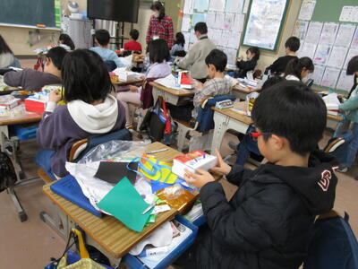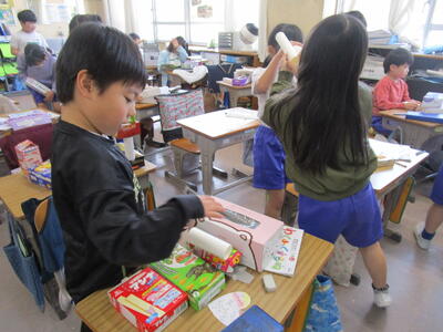 1年生の別のクラスでは、図工の「はことはこをくみあわせて」の学習で箱を組み合わせて、作りたいものを考えていました。
