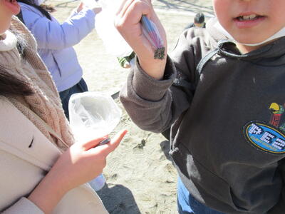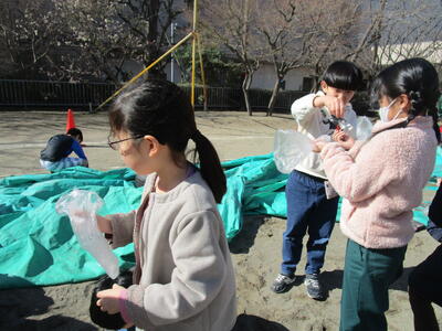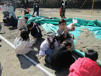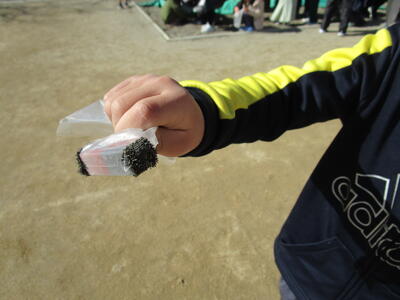 3年生、理科の磁石の学習で、砂場で夢中になって砂鉄を集めていました。「磁石にくっついてきた」「いっぱい集まった」「もさもさしている」などつぶやきながら、集まった砂鉄を見て、子どもたちはとても嬉しそうでした。