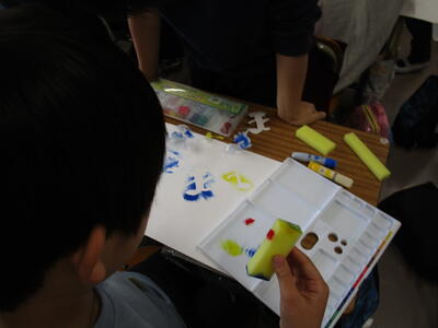 2年生、図工「いっぱいうつして」で、ものの形に切り取った紙を置いて、その周りを絵の具を付けたスポンジでたたいていました。魚や昆虫をかたどって、海の中や森の中を作っていました。