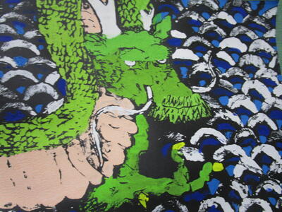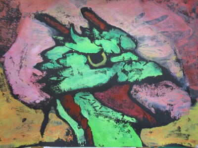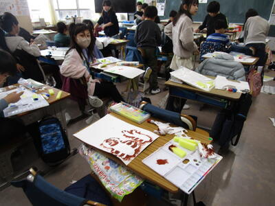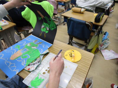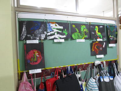 5年生、色版画で竜を表現していました。竜の形を彫ったり、黒い紙に色をのせたりするのは、大変な作業です。