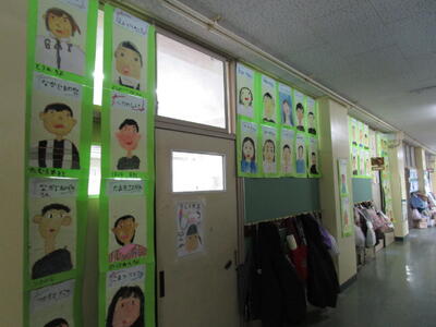 1年生が描いた6年生の似顔絵。卒業を祝う会では体育館に、その後は6年生の教室前に掲示されていました。今日は、その絵にリボンを巻いて、1年生が6年生の教室にプレゼントに行きました。とても、嬉しそうに、プレゼントを渡した1年生でした。しかし、担任の先生から、「今度の月曜日に6年生は卒業するので、もう、今週で会えなくなります」といわれると、1年生は、6年生に「ありがとう」をいいながら、手をにぎったり、バイバイをしたり、さみしそうな様子でした。