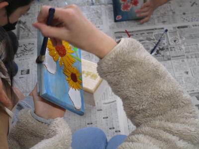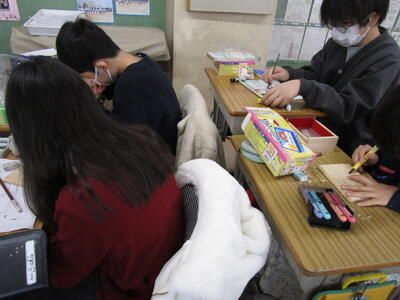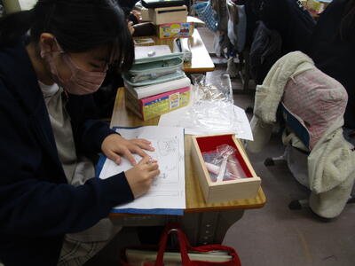 6年生、卒業記念のオルゴールづくりが完成に近づいてきました。色を塗ったり、ニスを塗ったりしていました。
