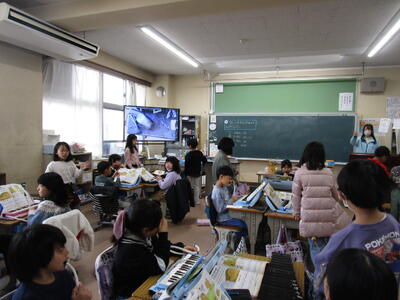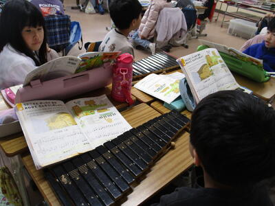 2年生、音楽で「こぐまの二月」を6つのグループに分かれて、楽器の演奏練習をしていました。練習の成果を授業の最後に発表しました。めあては「歌声と楽器の音を合わせて演奏しよう」なので、1グループずつ楽器をやり、それ以外の子どもたちが歌を歌っていました。楽器の演奏ときれいな歌声がよくあっていました。