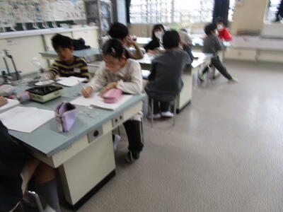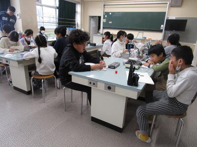 4年生、理科室で水が沸騰しているときに出ている泡の正体を確かめるために実験をしていました。結果からわかったことを、ノートにしっかりとまとめていました。