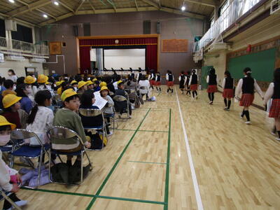 6年生、体育館で「一年生を迎える会」の移動や発表の練習をしていました。ちょっとしたお芝居をやるようです。どんな発表をするのか当日が楽しみです。