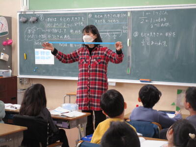 2年生、算数、「もとの大きさの半分を二分の一という」ということを学習していました。昨日は折り紙で、今日はテープを使って確認しました。具体物をしっかり使うとわかりやすく学べますね。