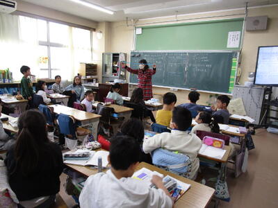 5年生、今年度着任した理科専科の先生が、担任の先生と一緒に1回目の授業で、お互いに自己紹介をしていました。