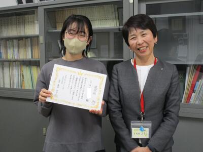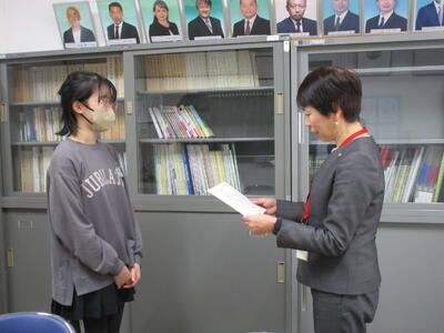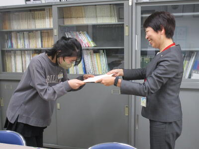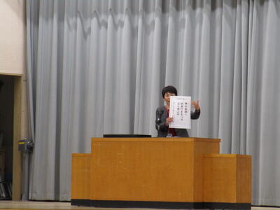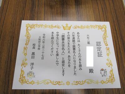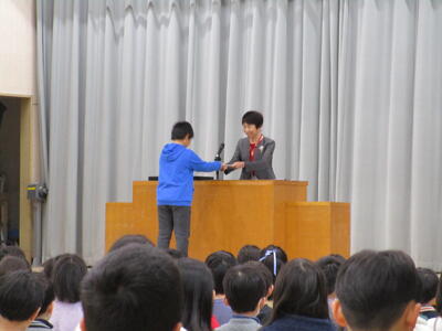 昼休み、校長室で「読書永世名人」の表彰をしました。読書永世名人は、6年間、読書名人(年間約100冊の本を読む人)になった人がもらえる賞です。「今、お気に入りの本は何ですか」と聞くと「かがみの孤城です。本で読んで感動したので、映画を見に行きました。そこでも感動したので、DVDを買って家でも見ています」と答えてくれました。本を読んで自分が想像した世界と映像化された世界を比べて楽しめるなんて素敵ですね。