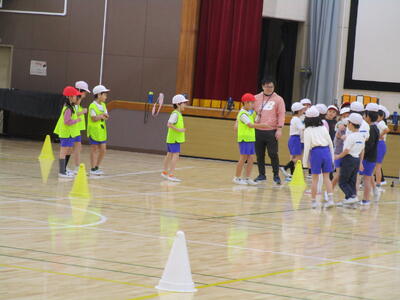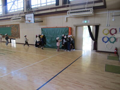 風も強く、寒い中、1年生のあるクラスは、レクリエーション活動を体育館でやっていました。準備運動で体を温めるために色探しゲームをやっていました。、先生が「白い色」というと、皆床の白いラインをタッチし「オレンジ色」というとマットの横にタッチしていました。子供たち、みつけるのも移動するのもとても素早かったです。