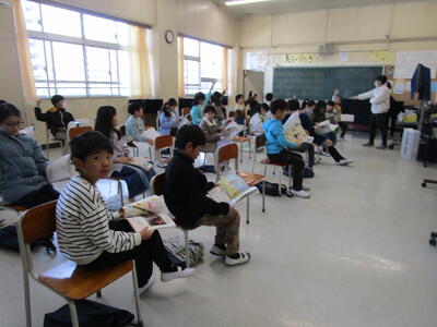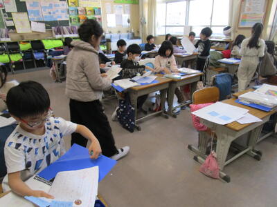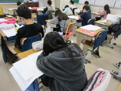 3年生、国語「強く心にのこったことを」で作文を書いていました。内容は「長縄大会のこと」や「犬が飼いたくてみにいったときのこと」「旅行のこと」などです。書き終わった作文を読みあっているクラスもありました。