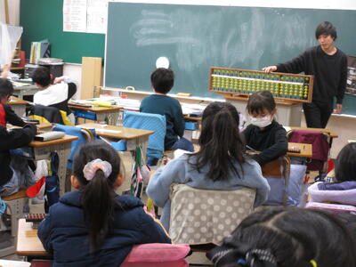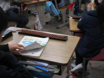 3年生、算数で「そろばん」の学習です。今日初めてそろばんをさわった子もいたようで、そろばんに興味津々です。