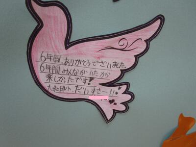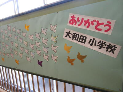 6年生、校内の学年掲示板に大和田小学校や在校生、教職員にあてたメッセージが掲示されていました。鳩の中には、6年生一人ずつからのメッセージが書き込まれています。6年生の感謝の思いが伝わってきました。