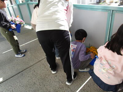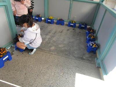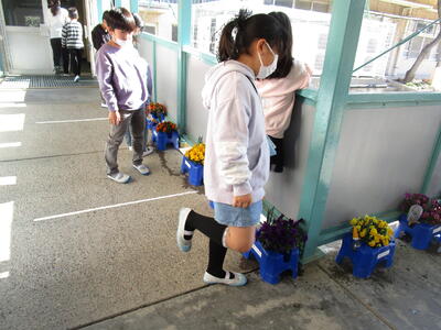 2年生、卒業式に備えて、自分たちが育てた花の中で、きれいに咲いているものを選んで、体育館の通路に、並べています。卒業式は月曜日なので、水やりをしっかりしていました。花道ができて、卒業生も喜ぶに違いありません。