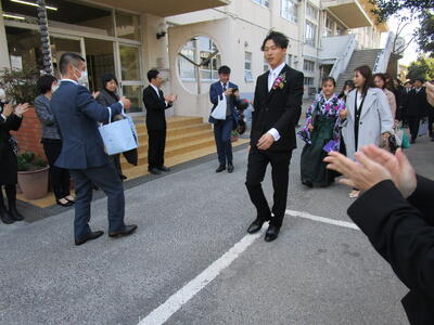 3年生、クラスで写真を撮るようで、昇降口から外に元気にかけだしています。子供たちも張り切っています。