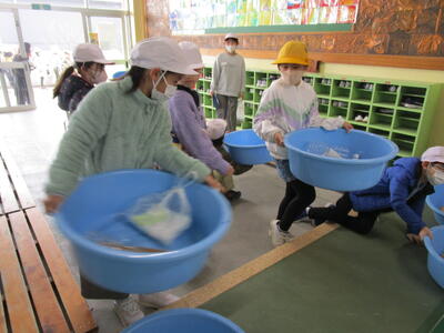 3年生、社会科の昔体験で、洗濯板とたらいを使って洗濯をしていました。教室で洗い方を確認して、たらいをもって、いざ、外へ・・・!子供たちは、手を真っ赤にしながら、洗濯物をこすっていました。