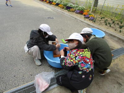 4年生、自分の好きな春の花を描いていました。花壇には、チューリップや金魚草などたくさんの花が咲いていて、子供たちも楽しそうに描いていました。