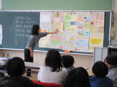 1年生、国語「学校のことをつたえあおう」で、先週、いろいろな先生にインタビューしたメモをもとにして、メモを整理して練習したり、クラスの皆の前で発表をしたりしていました。