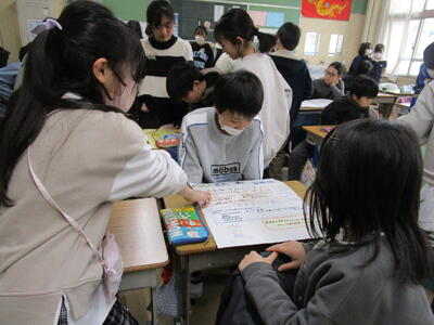 4年生、教室で委員会のポスターを見ながら、「来年度、どの委員会がいいかな・・・」と考えていました。このポスターは5年生が、国語の「ポスターを作ろう」の学習で、クラスの委員会ごとに集まって書いたものです。限られた紙面の中でうまく伝えるための工夫が、いっぱいつまっていました。