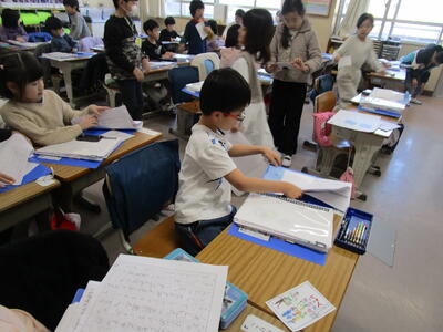 1年生、1年間で学校で学習した作文や生活科のカード等をファイルに入れていました。ファイルは、自分の書いたものでいっぱいになっています。1年間積み重ねてきたことを振り返る子供たちもうれしそうです。