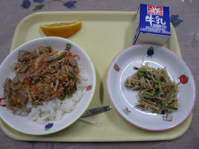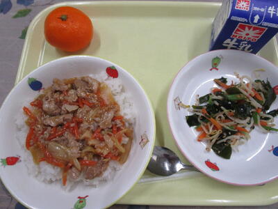 牛乳 ごはん 豚丼(具) かき玉汁 春雨サラダ しゅわしゅわゼリー