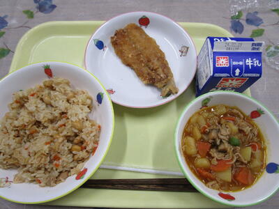 牛乳 大豆入り五目御飯 いわしの竜田揚げ 肉じゃが