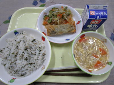 牛乳 わかめご飯 ひじき入り春巻き 寒天の中華和え 中華風スープ