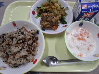 牛乳 ひじきご飯 鶏肉の和風ソース おかか和え みかんヨーグルト